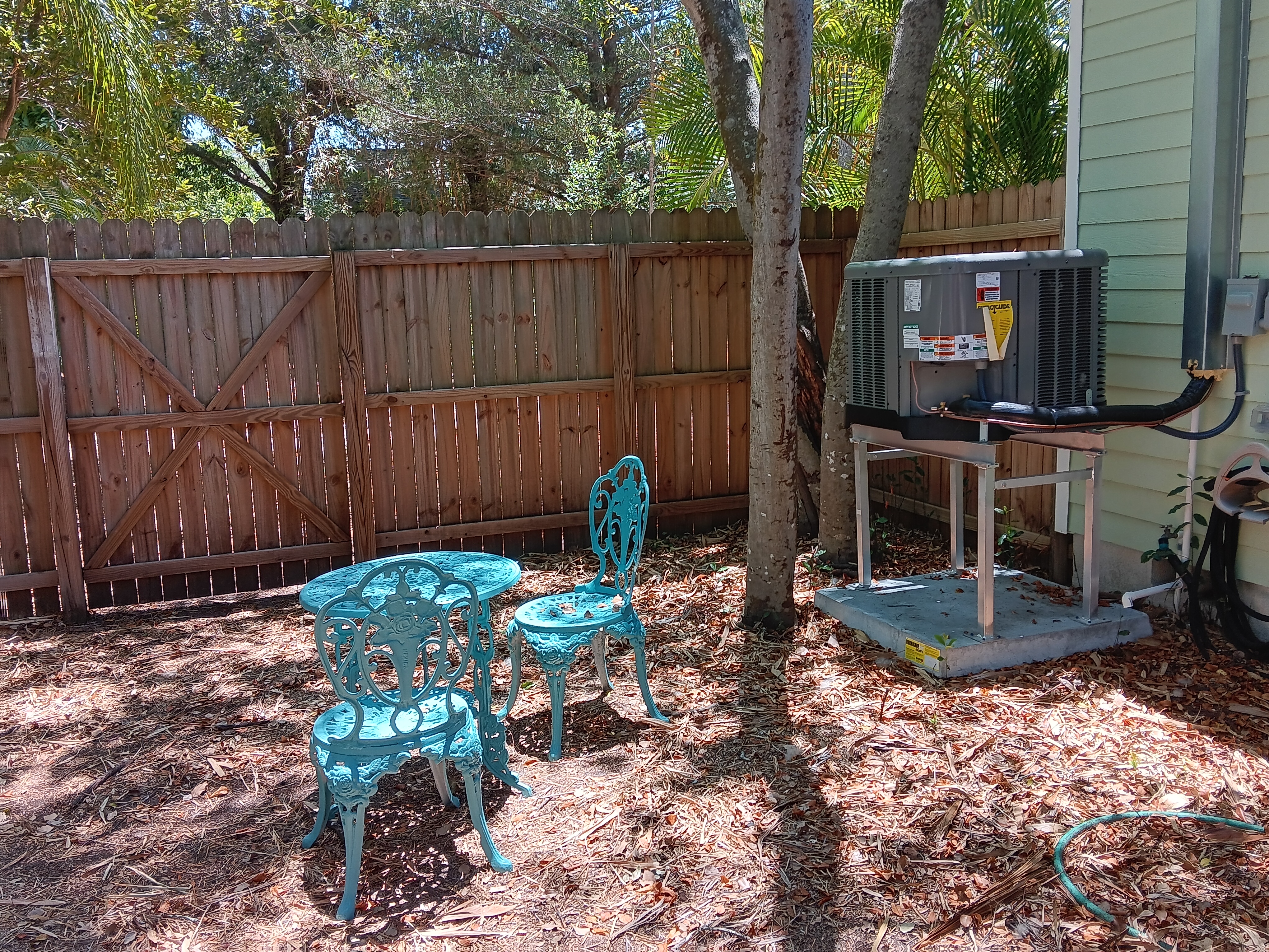 There is a private fenced yard with a Bar-B-Q grill and picnic table. The lovely yard has amazing trees, groves of